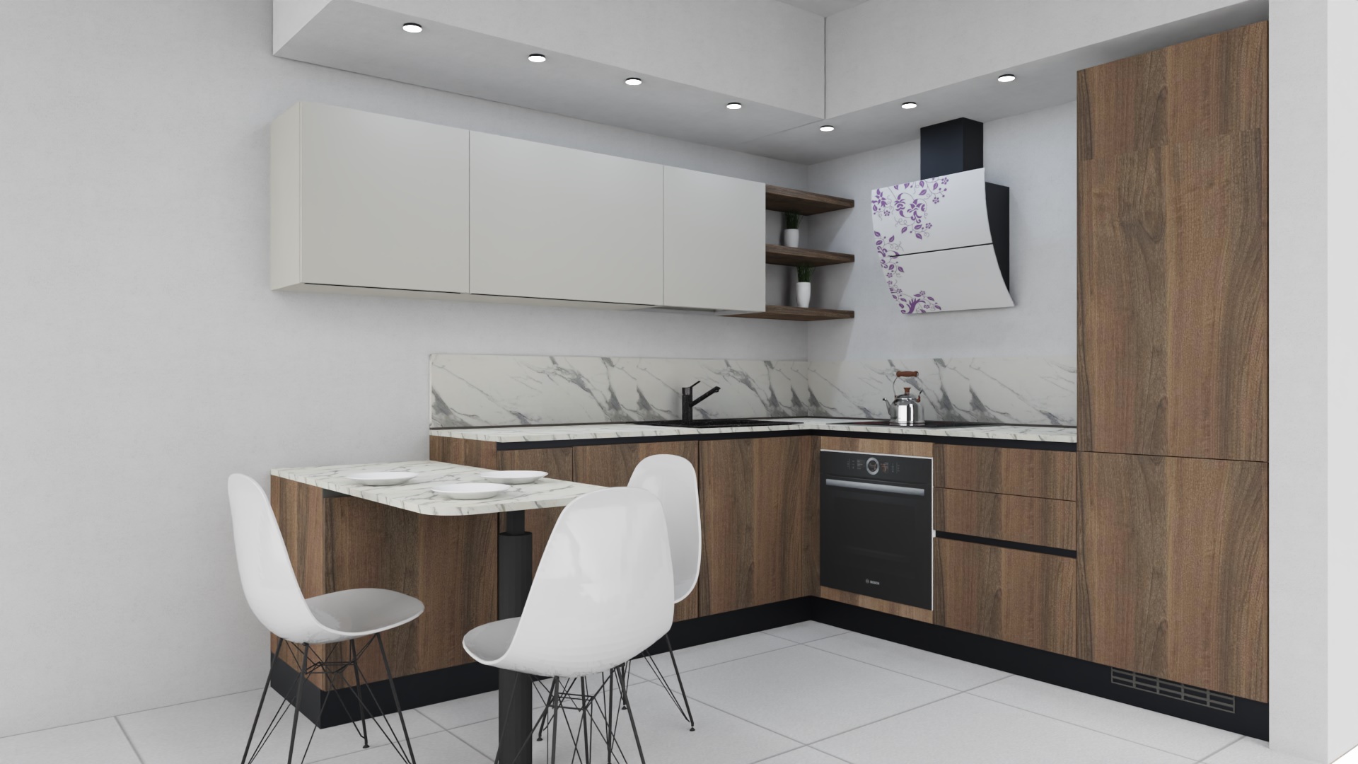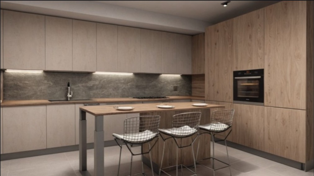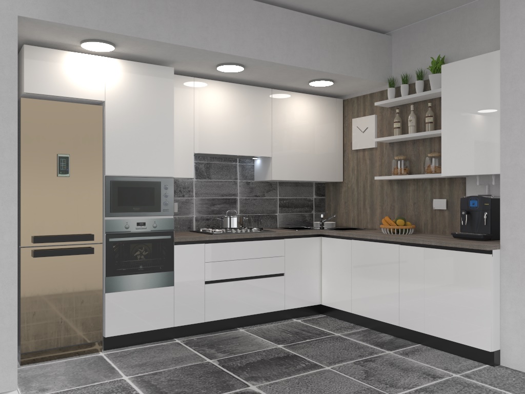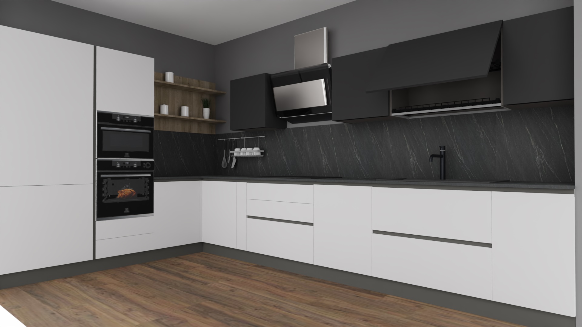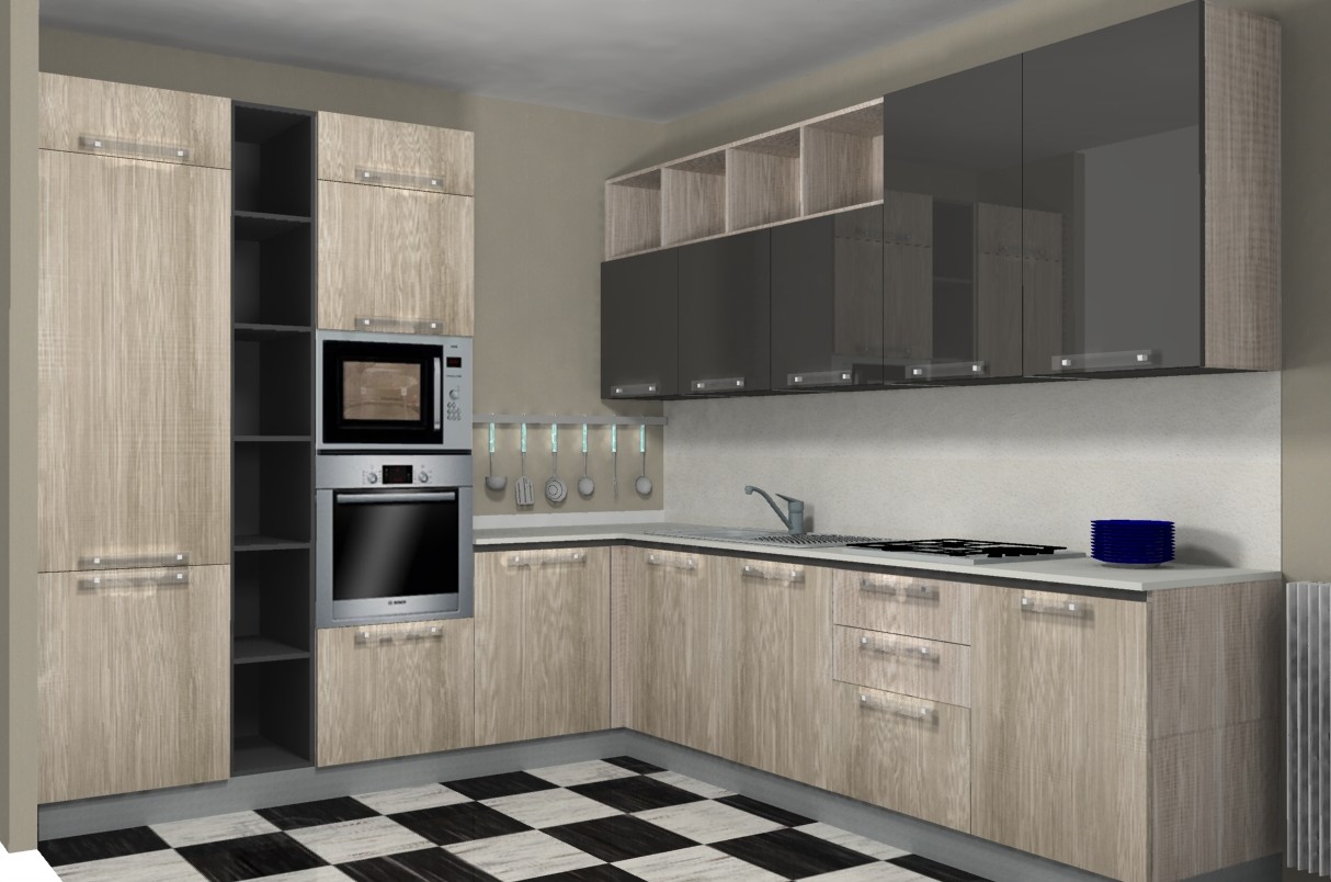 Dal modello 3D , viene ottenuta un' immagine fotorealistica ad alta risoluzione che fotografa la vostra cucina completata.